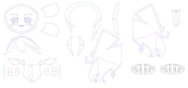 머리, 얼굴, 옷 등에 대한 도면입니다.
