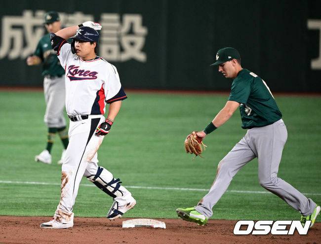 4-5로 뒤집힌 7회 말이다. 1사 후 대타 기용이다. 강백호가 좌중간을 넘기는 2루타로 아이언맨 감독의 체면을 살렸다. 단숨에 득점권 찬스다. 그런데 말도 안되는 상황이 벌어진다. 2루수(글렌디닝)가 펄쩍펄쩍 뛰며 손을 젓는다. 아웃이라는 말이다. 무슨 소리, 타이밍은 한참 늦었는데. 호주 벤치가 재심을 요청한다. 중계화면이 느리게 재생되며 진실이 드러난다. 세리머니 도중 잠깐 발이 떨어진 틈이다. 그 사이를 놓치지 않고 뒤에서 태그 플레이가 이뤄진 것이다.