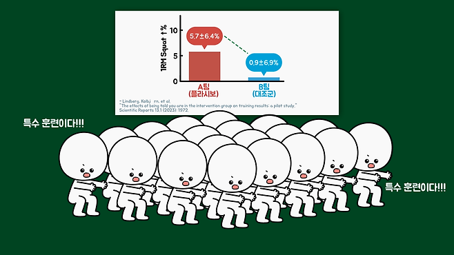 예를 들어서 아그데르 대학(University of Agder)의 콜비욘 린드베리(Kolbjørn Lindberg) 연구팀은 40명의 운동선수를 대상으로 절반에게는 개인별 특수 훈련을, 절반에게는 일반 훈련을 시킨다고 이야기하고 같은 운동을 시켰습니다. 그 결과 스쾃 기록 증가량이 유의미하게 차이 났다고 합니다.