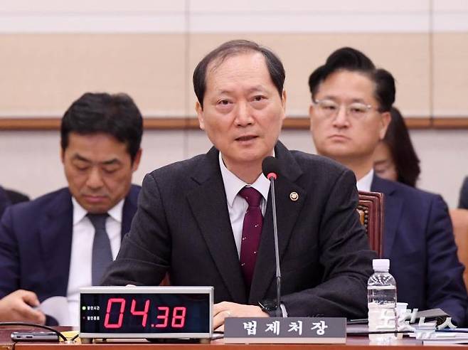 이완규 법제처장이 14일 오전 국회 법제사법위원회 법제처 등에 대한 국정감사에 출석해 의원들의 질의에 답하고 있다.