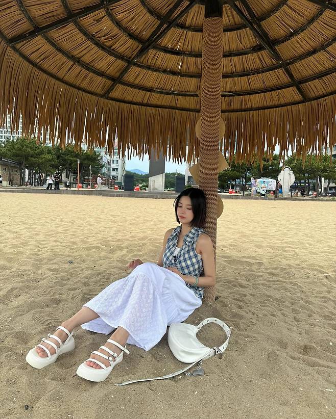 푸른 체크 패턴의 민소매 셔츠에 맥시한 화이트 스커트를 매치한 룩은 해변의 모래색과 대비를 이루며 시선을 끌었고, 바다와 도시를 오가는 컷 속에서도 흐트러짐 없는 실루엣이 인상 깊었어요.