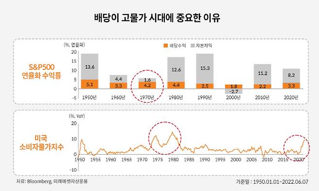 거시경제 환경은 인플레이션으로 인해 배당 투자자에게 유리하게 전개되고 있다. 김수정 매니저는 "1950년대부터 10년 단위로 볼 때 고 인플레이션 시기마다 투자 포트폴리오 수익률을 방어한 것은 배당"이라며 "ETF의 분배금은 기업의 순이익에 의존하는 배당금과 달리 부동산 임대수익, 채권 이자수익, 옵션 프리미엄 매도 수익 등 다양한 재원이 존재하기에 시장 상황에 맞는 ETF에 골라 배당 안정성도 추구할 수 있다"고 말했다.