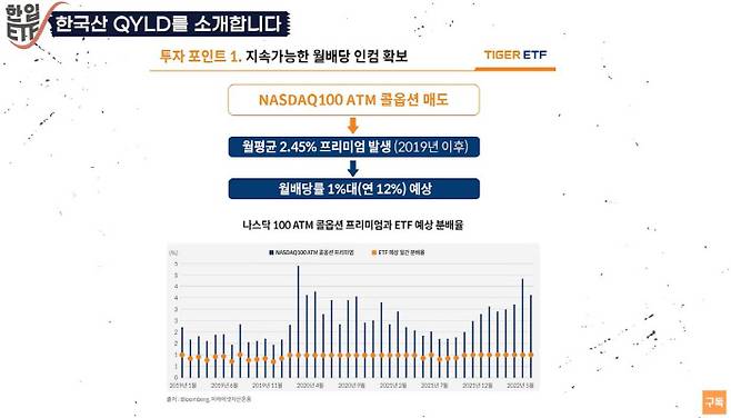김수정 매니저는 "월평균 1%의 분배금 수익률을 얻을 수 있어 1억원을 투자하면 매월 약 100만원의 분배금 현금흐름을 기대할 수 있는 상품"이라며 "나스닥100 지수가 최근 높은 변동성을 보이면서 옵션 프리미엄의 가치가 상승했다는 점이 높은 월 분배금 수익률을 가능하게 한 동력"이라고 덧붙였다.