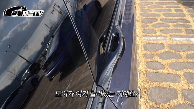 도어는 일반적인 차량과 달리 특이한 위치에 달려 있는데, 고급스러운 느낌입니다. 전자식으로 되어있어요. 안에서 문 열 때도 레버가 하나가 툭 튀어나와 있더라고요. 그걸 당겨서 열면 된다고 합니다. 근데 저는 차라리 없으면 되게 예쁠 것 같아요.