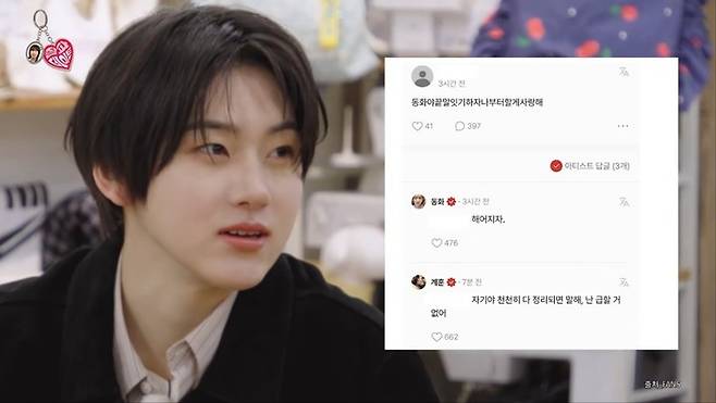 팬과의 소통 에피소드에서도 캐릭터가 두드러졌다. 한 팬이 "사랑해"로 시작하는 끝말잇기를 제안하자, 동화는 돌연 "헤어지자"고 답변했다. 그러자 계훈은 자신에게 마음을 돌리라는 여유로운 대댓글을 남겨 대비 효과를 더욱 부각시켰다. 재재는 "갑자기 왜 헤어지자고 했냐"고 물었고, 동화는 "내가 불안감을 느꼈다"고 컨셉을 유지해 웃음을 자아냈다.