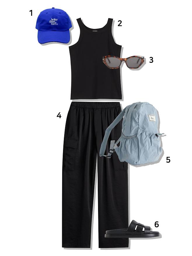 1 모자 : 베러댄서프(39,000원) 2 슬리브리스 탑 : H&M(9,900원) 3 선글라스 : H&M(17,900원) 4 팬츠 : H&M(34,900원) 5 백팩 : 레니비(63,000원) 6 슈즈 : H&M(34,900원)