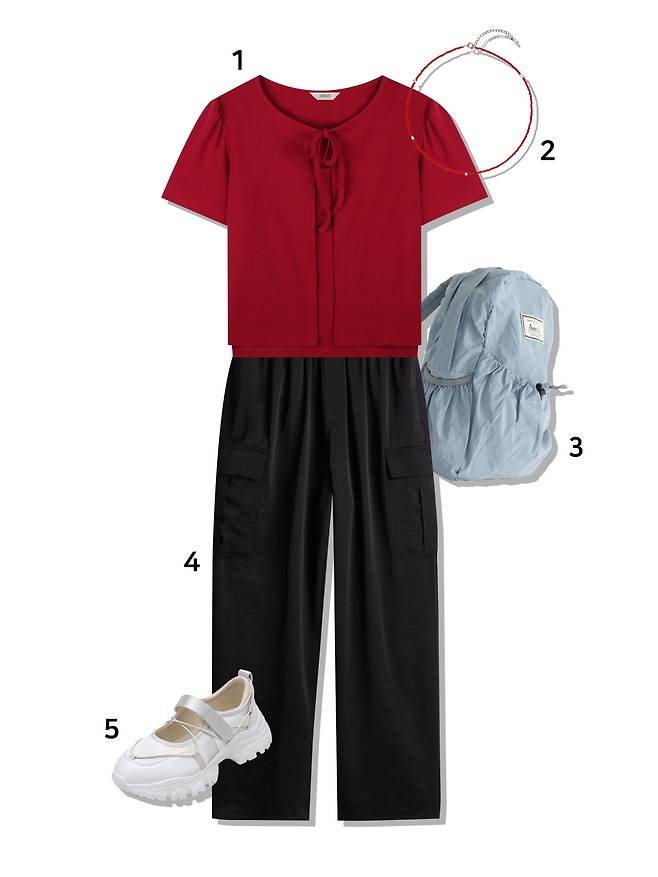 1 가디건 : 주르티(72,000원) 2 목걸이 : 식품닷(27,000원) 3 백팩 : 레니비(63,000원) 4 팬츠 : H&M(34,900원) 5 슈즈 : 솔트앤초콜릿(119,000원)
