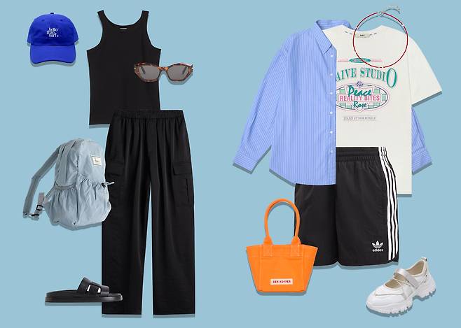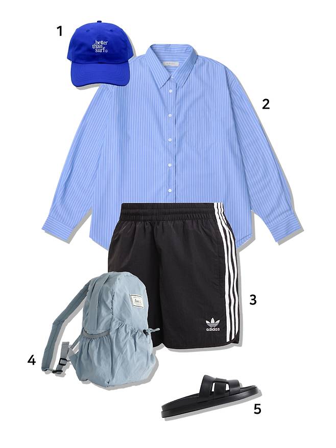 1 모자 : 베러댄서프(39,000원) 2 셔츠 : 시야쥬(89,000원) 3 쇼츠 : 아디다스(69,000원) 4 백팩 : 레니비(63,000원) 5 슈즈 : H&M(34,900원)