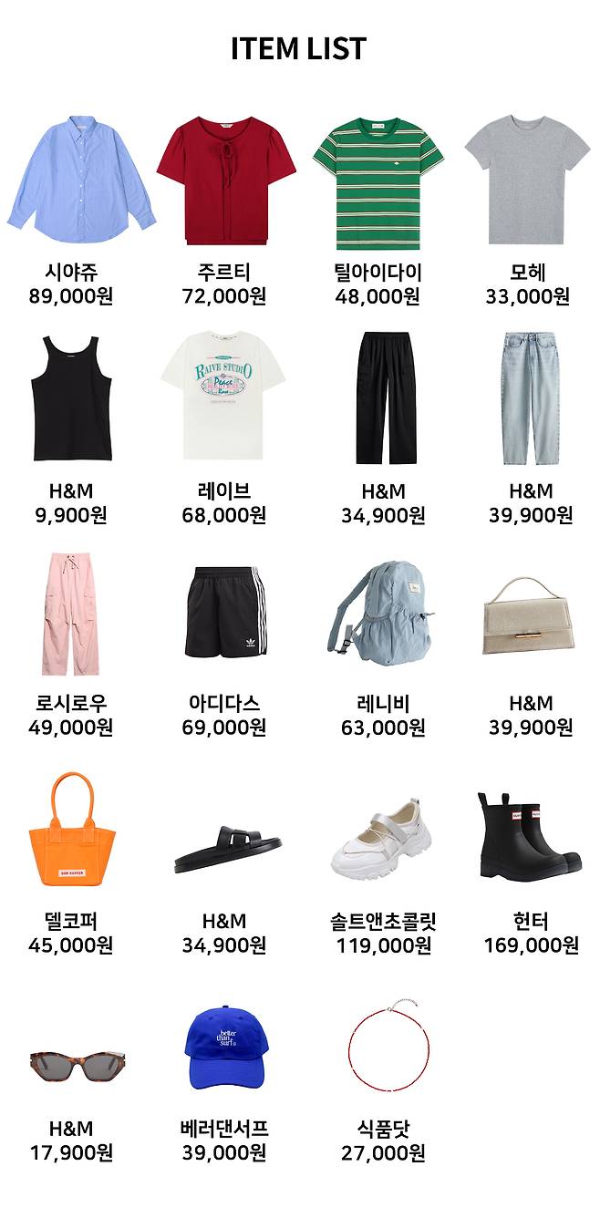 1 선글라스 : H&M(17,900원) 2 셔츠 : 시야쥬(89,000원) 3 티셔츠 : 모헤(33,000원) 4 쇼츠 : 아디다스(69,000원) 5 가방 : H&M(39,900원) 6 레인부츠 : 헌터(169,000원)