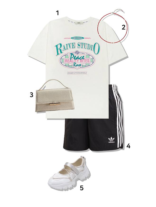 1 티셔츠 : 레이브(68,000원) 2 목걸이 : 식품닷(27,000원) 3 가방 : H&M(39,900원) 4 쇼츠 : 아디다스(69,000원) 5 슈즈 : 솔트앤초콜릿(119,000원)