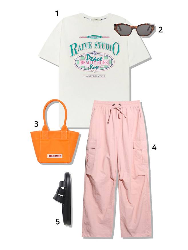 1 티셔츠 : 레이브(68,000원) 2 선글라스 : H&M(17,900원) 3 미니백 : 델코퍼(45,000원) 4 팬츠 : 로시로우(49,000원) 5 슈즈 : H&M(34,900원)