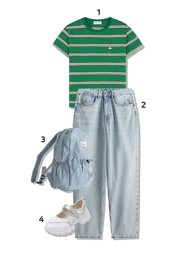 1 상의 : 틸아이다이(48,000원) 2 데님 : H&M(39,900원) 3 백팩 : 레니비(63,000원) 4 슈즈 : 솔트앤초콜릿(119,000원)