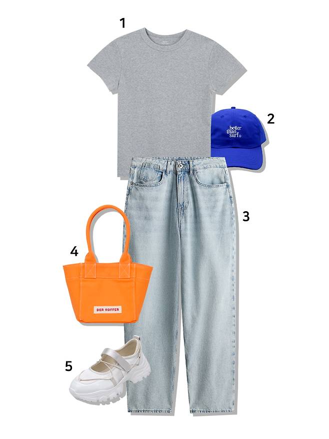 1 티셔츠 : 모헤(33,000원) 2 모자 : 베러댄서프(39,000원) 3 데님 : H&M(39,900원) 4 미니백 : 델코퍼(45,000원) 5 슈즈 : 솔트앤초콜릿(119,000원)