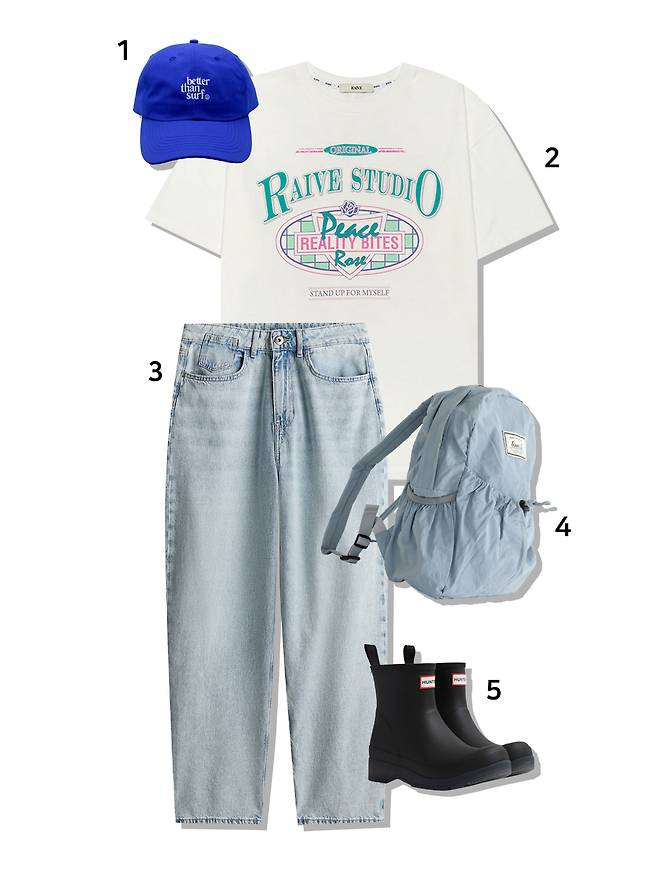 1 모자 : 베러댄서프(39,000원) 2 티셔츠 : 레이브(68,000원) 3 데님 : H&M(39,900원) 4 백팩 : 레니비(63,000원) 5 레인부츠 : 헌터(169,000원)