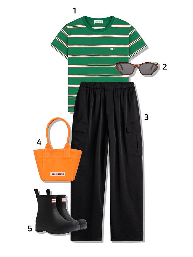 1 선글라스 : H&M(17,900원) 2 티셔츠 : 모헤(33,000원) 3 팬츠 : 로시로우(49,000원) 4 가방 : H&M(39,900원) 5 레인부츠 : 헌터(169,000원)