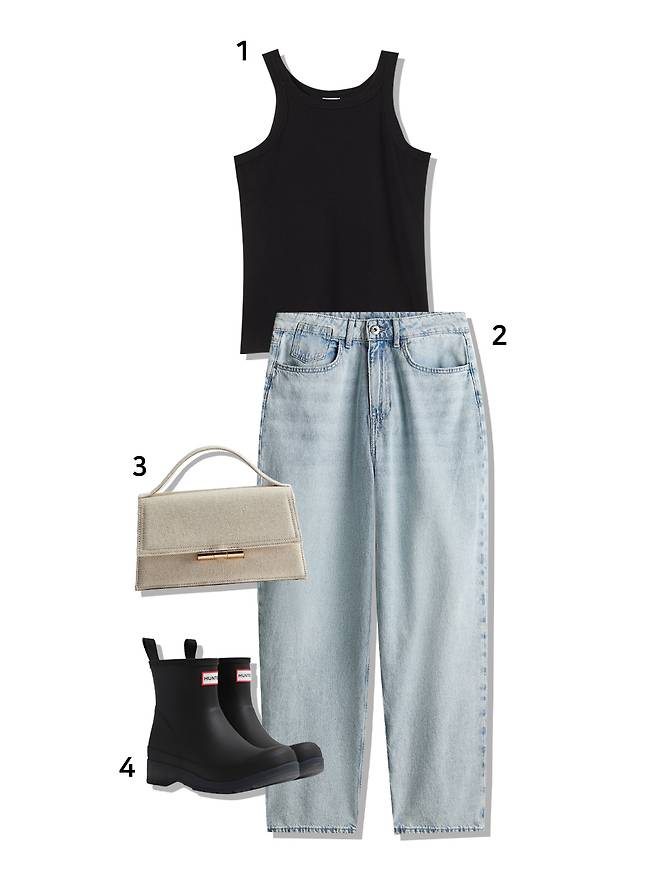 1 슬리브리스 탑 : H&M(9,900원) 2 데님 : H&M(39,900원) 3 가방 : H&M(39,900원) 4 레인부츠 : 헌터(169,000원)