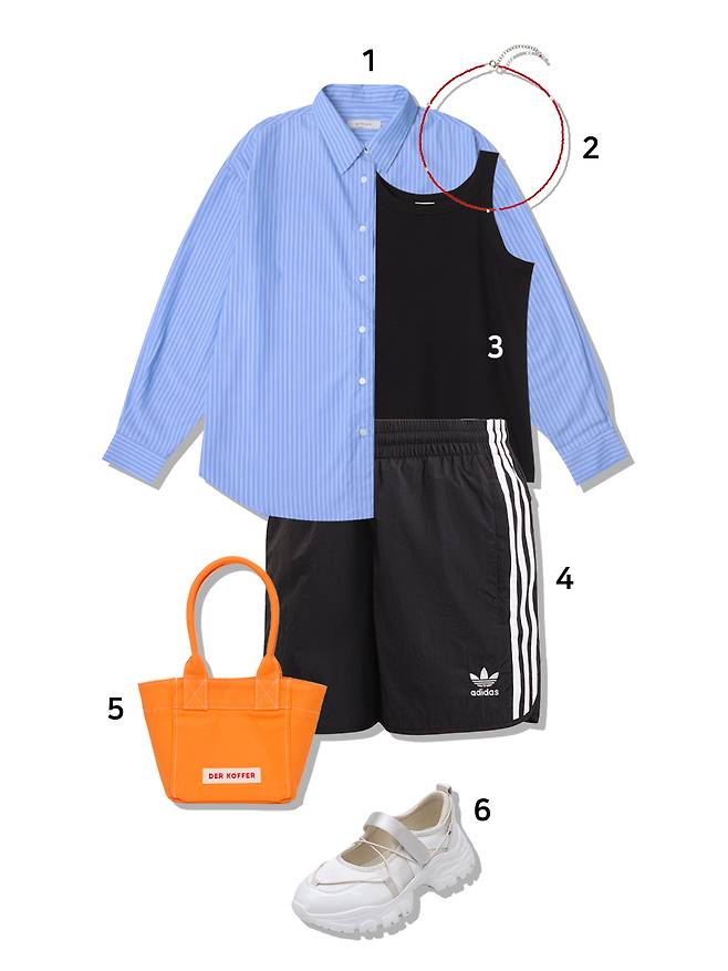 1 셔츠 : 시야쥬(89,000원) 2 목걸이 : 식품닷(27,000원) 3 슬리브리스 탑 : H&M(9,900원) 4 쇼츠 : 아디다스(69,000원) 5 미니백 : 델코퍼(45,000원) 6 슈즈 : 솔트앤초콜릿(119,000원)