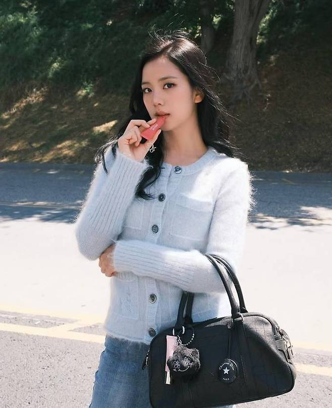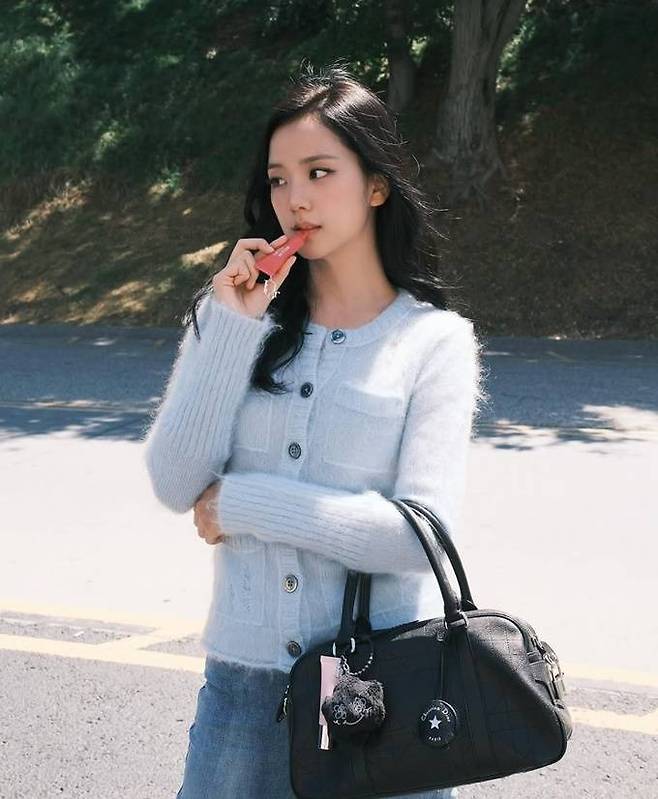 지수는 최근 자신의 인스타그램에 할머니 옷장에서 꺼낸 듯한 민트빛이 감도는 화사한 스카이 블루 컬러의 클래식한 카디건룩을 게재했다.