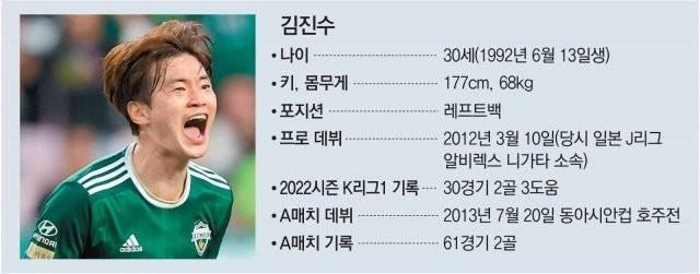 대표팀 내 입지도 탄탄해졌다. 김진수는 카타르 월드컵 아시아지역 최종예선 10경기 중 6경기에 선발로 나서 같은 포지션 경쟁자인 대구의 홍철(32·4경기)을 앞서고 있다. 6월 4차례, 9월 2차례 A매치에서도 김진수는 4경기에 주전으로 나서 2도움을 기록했다. 30대가 돼서야 처음 경험하게 될 월드컵에 대해 김진수는 “기대된다”고 했다.
