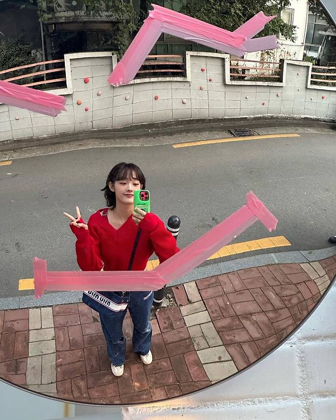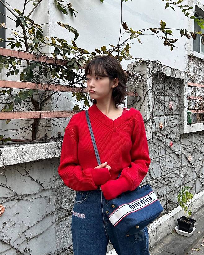 공개된 사진에서 이유미는 브이넥 빨간 니트를 입고 청바지와 브라운 가죽 재킷을 입었다. 빨간 니트는 옆라인을 자랑하며 날씬한 몸매를 보여주었다.