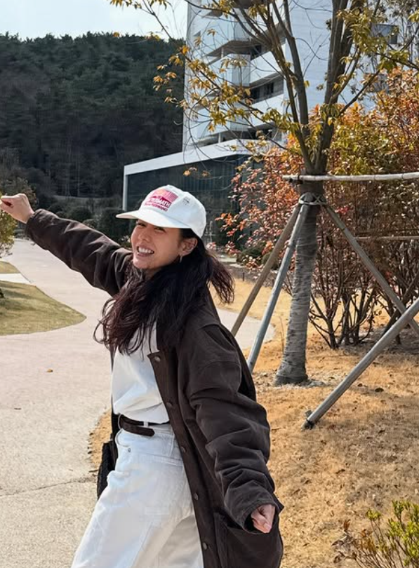 신발은 그레이 컬러의 운동화를 선택해 편안하면서도 트렌디한 무드를 더했어요. 부담 없이 착용 가능한 데일리 아이템으로 세련미를 잃지 않았죠.