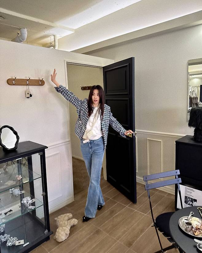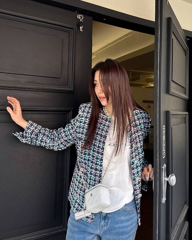 사진 속 박하선은 부츠컷 청바지에 트위드자켓을 입고 샤넬 미니백으로 포인트를 준 세련된 패션을 선보였습니다.