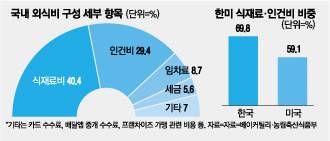 이 같은 비중은 해외 선진국과 비교해도 매우 높다. 예컨대 미국에서 식재료비·인건비가 차지하는 비중은 59.1%였다. 우리나라가 미국보다 10.7%포인트나 높다.