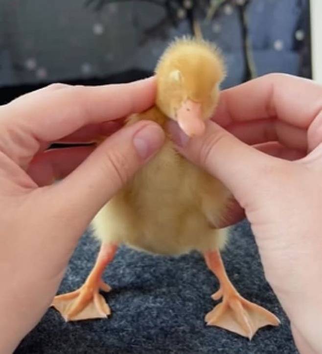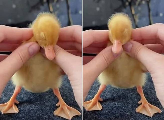 한눈에 봐도 앙증 맞은 몸집을 가진 아기 오리가 있습니다. 잠시후 집사는 아기 오리에게 손을 뻗어서 조심스럽게 어깨를 마사지해주기 시작했는데요.