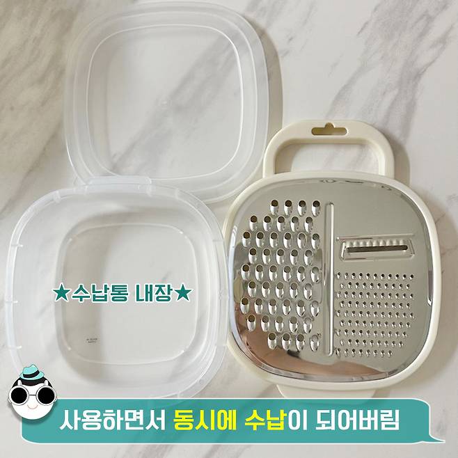수납통 일체형 제품이라는 게 킬포~ 채소를 슥슥 간 뒤에 별도의 용기를 준비할 필요가 없다는 거. 수납통에 곧바로 저장이 되니 진짜 편해요. 굳굳.
