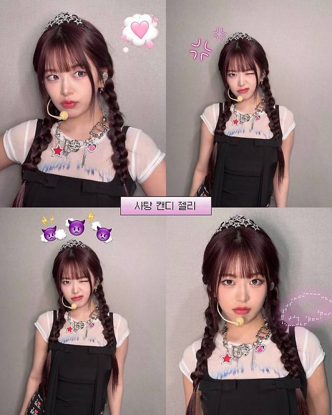 안유진은 별 장식이 돋보이는 티아라를 착용해 마치 동화 속 공주 같은 모습을 연출했다. 헤어스타일은 양 갈래로 길게 땋아 귀여운 무드를 강조했으며, 그녀의 트레이드마크인 생기 넘치는 미소가 더해져 더욱 매력적인 분위기를 자아냈다. 특히, 컬러 렌즈를 활용한 오드아이 스타일이 신비로움을 더하며 색다른 포인트를 주었다.