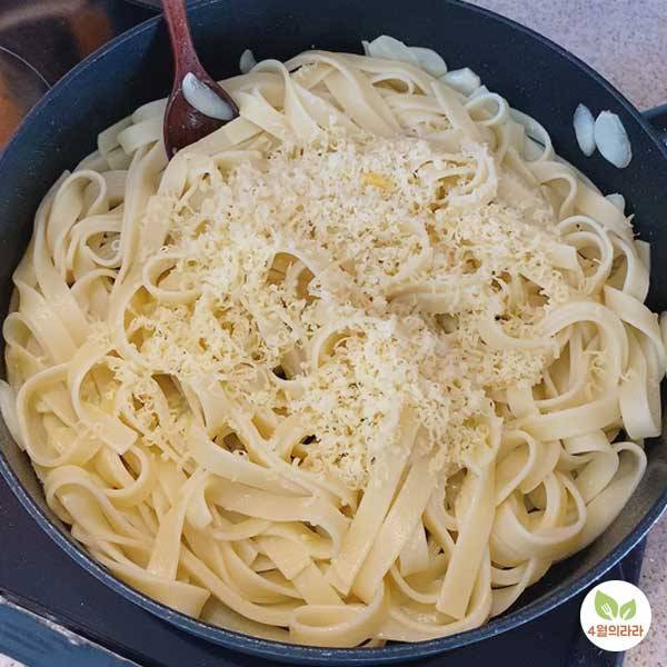 → 삶은 파스타면을 팬에 넣고 마늘과 함께 볶아줍니다.
