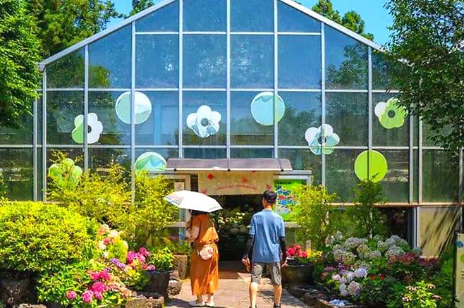 특히나 유리온실은 이곳의 하이라이트 중 하나입니다. 실내로 들어서면 정원 전체가 또 하나의 작은 세계처럼 펼쳐집니다. 한 송이 한 송이 정성스럽게 배치된 수국들이 고요하게 반짝이고, 산책하는 이들의 발걸음도 조심스레 느려집니다.