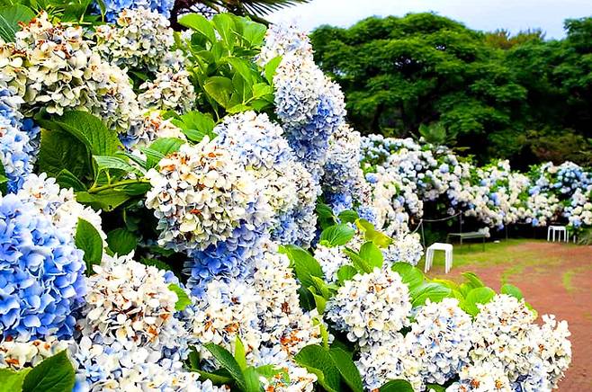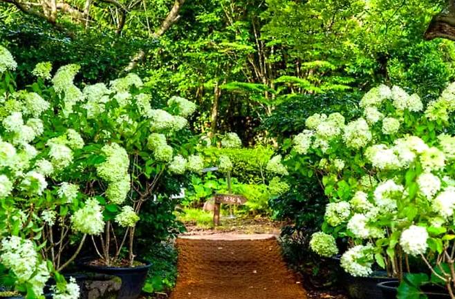 꽃의 색이 달라지는 건 흙의 성질 덕분입니다. 산성 토양에서는 파란색, 알칼리성이 강할수록 분홍색으로 변하는 수국은, 정원의 이곳저곳에서 저마다 다른 빛깔을 띄며 관람객을 맞이합니다.