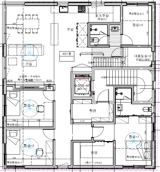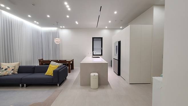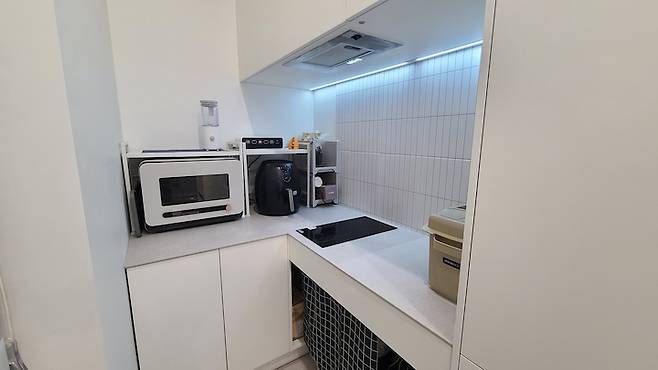 사용한 지 6개월이 지났는데, 삼겹살이나 제육 같은 요리 굽는 거 아닌 일반 요리 정도는 후드 없이 잘 지내고 있습니다. 나비엔 청정 환기 시스템을 설치하여 요리 모드로 해 놓으면 환기 금방 됩니다. 주방 안쪽으로 보조 주방이 있습니다. 저 멀리 큐커가 보이네요. 그런데 저희 집 김치냉장고는 어디에 있을까요?