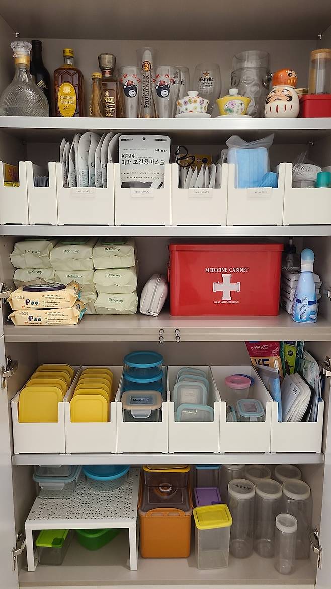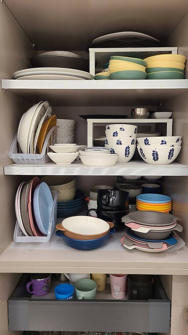 냉장고 바로 옆 키 큰 장에는 자주 사용하는 그릇들을 넣는 용도로 사용하고 있어요. 하단 서랍형 선반에는 컵 종류를 넣어 아이들이 손쉽게 꺼내어 쓰도록 했습니다.