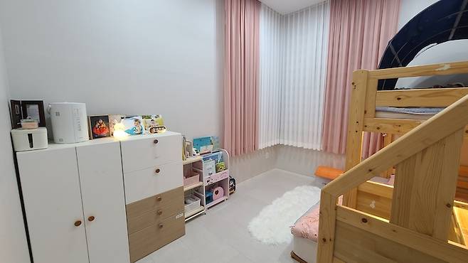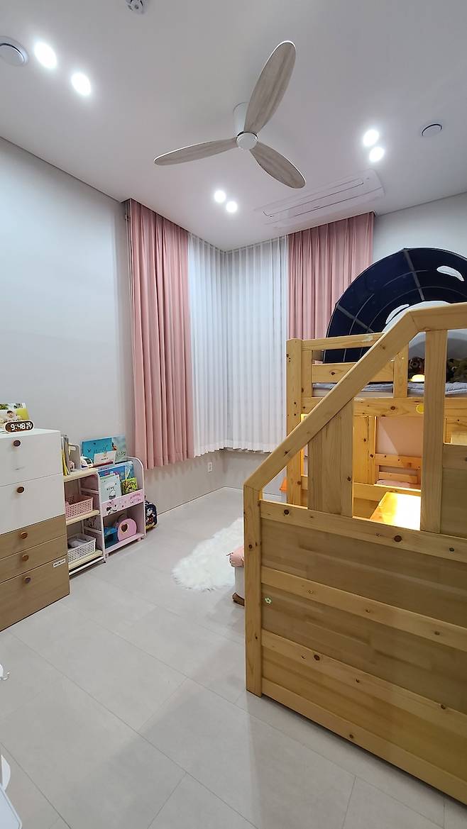 다음은 7살 딸의 방입니다. 이전 집에서 오빠와 함께 쓰던 방에 놓으려고 2층 침대를 사주었는데, 혼자 자는 걸 무서워해서 아무도 사용하지 않았다는 안타까운 사연이 있는 침대입니다. 새 집으로 이사 와서는 각자 방이 생겼지만 따로 자는 걸 무서워할까봐 퀸 매트리스를 1층에 놓고 처음엔 오빠와 함께 재웠어요. 그런데 자기만의 방이 생겨서인지, 더 이상 무서워하지 않고 자연스럽게 따로 자게 되어서 지금은 딸아이 혼자 퀸 사이즈 침대에서 굴러다니면서 잠들고 있습니다 ^-^;;