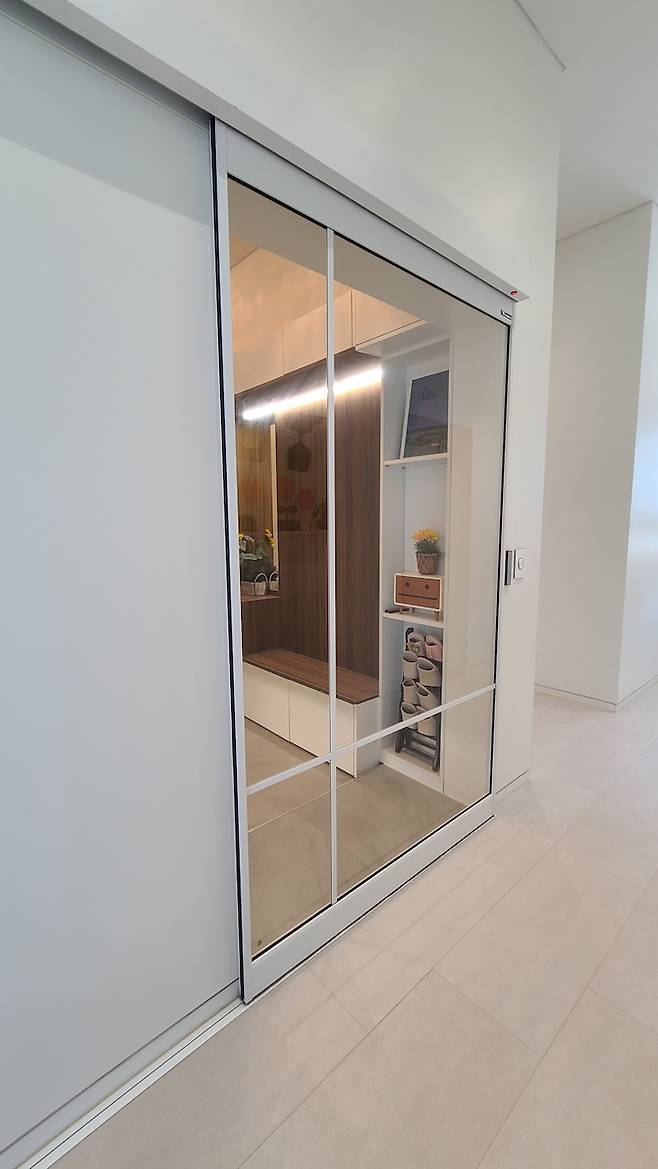 층고가 높다 보니 문 높이도 자연스레 커지다 보니, 아이들에게 수동 중문은 위험할 것 같았어요. 그래서 자동 중문을 설치했습니다. 아이들은 키가 작아 센서가 인식을 못 하는 경우가 종종 있는데, 별도 스위치로 개폐 가능해서 편리하게 사용하고 있어요.