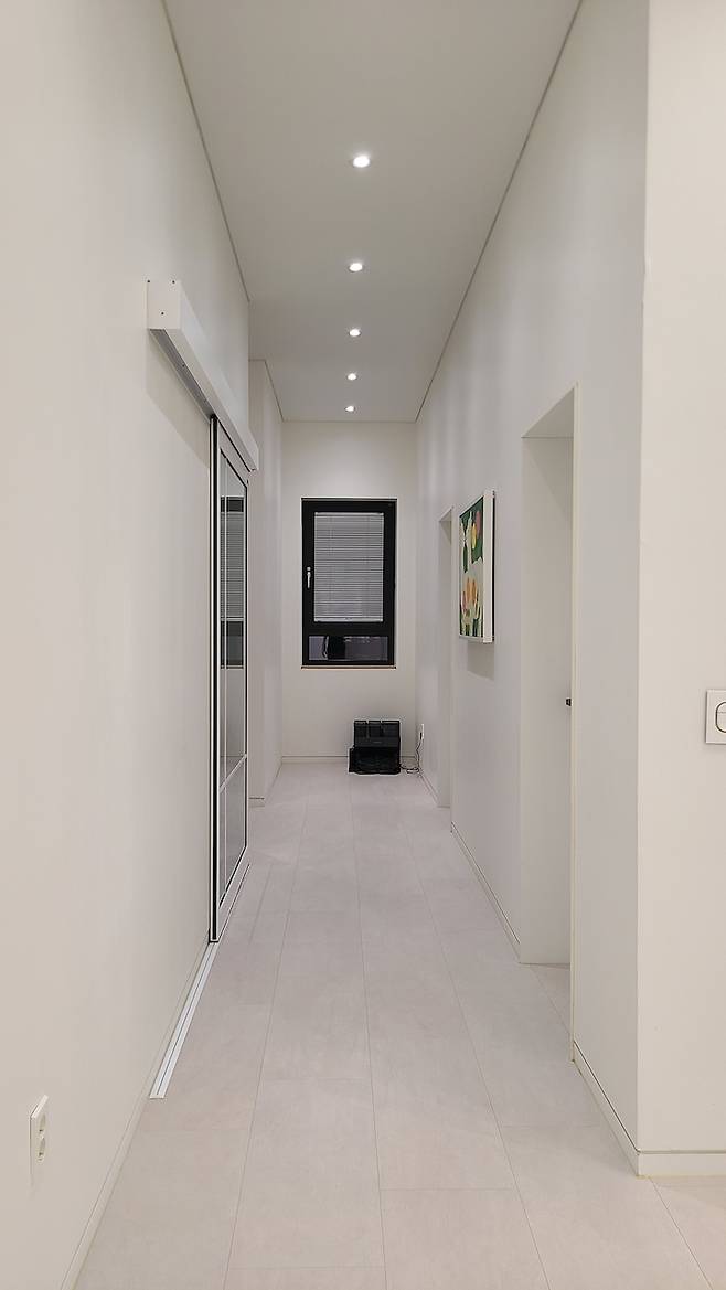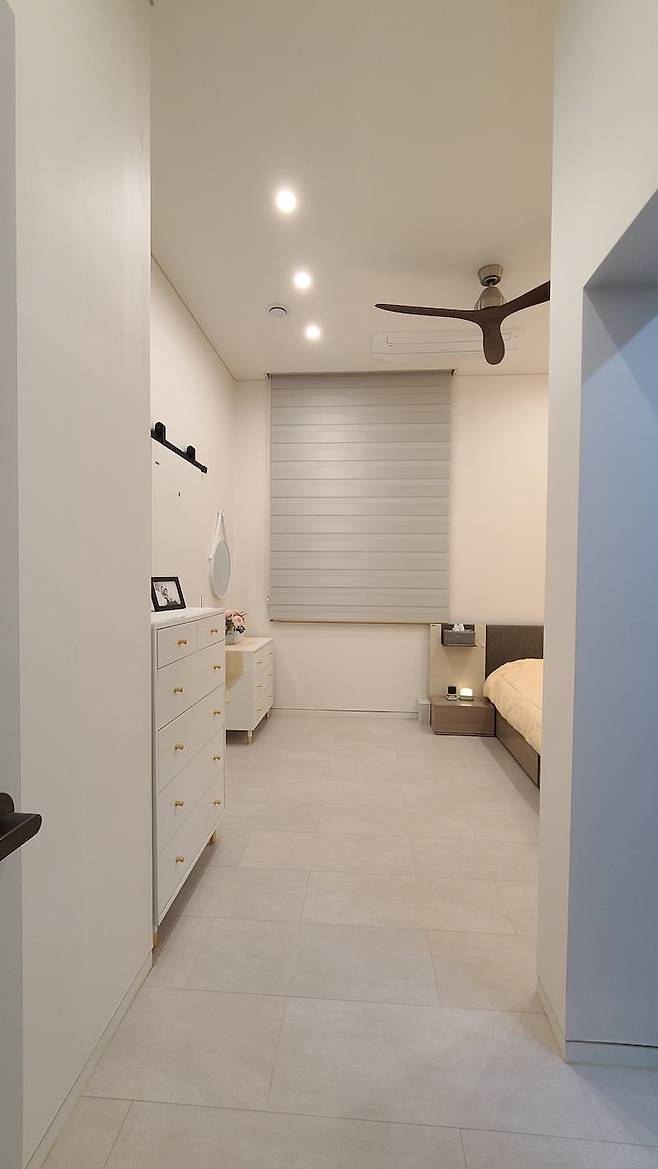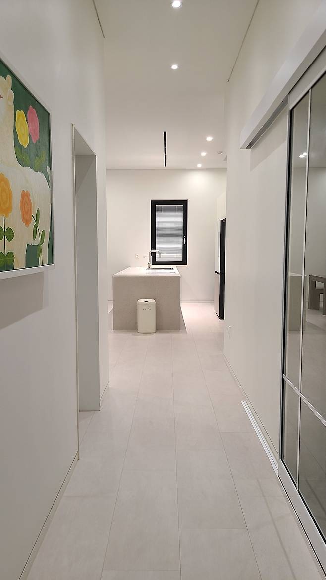 현관으로 들어와서 우측으로 꺾으면 주방이 눈에 들어옵니다. 복도 양 끝으로 큰 창을 내어서 환기와 채광에 신경을 썼습니다. 조명의 경우는 직부등을 최소화하고 다운라이트를 최대한 활용하였습니다. 방마다 위치한 실링팬 때문이기도 하지만, 간접 조명으로 조명 조작을 세분화하여 필요한 만큼만 켜고 생활하기 위해서입니다.