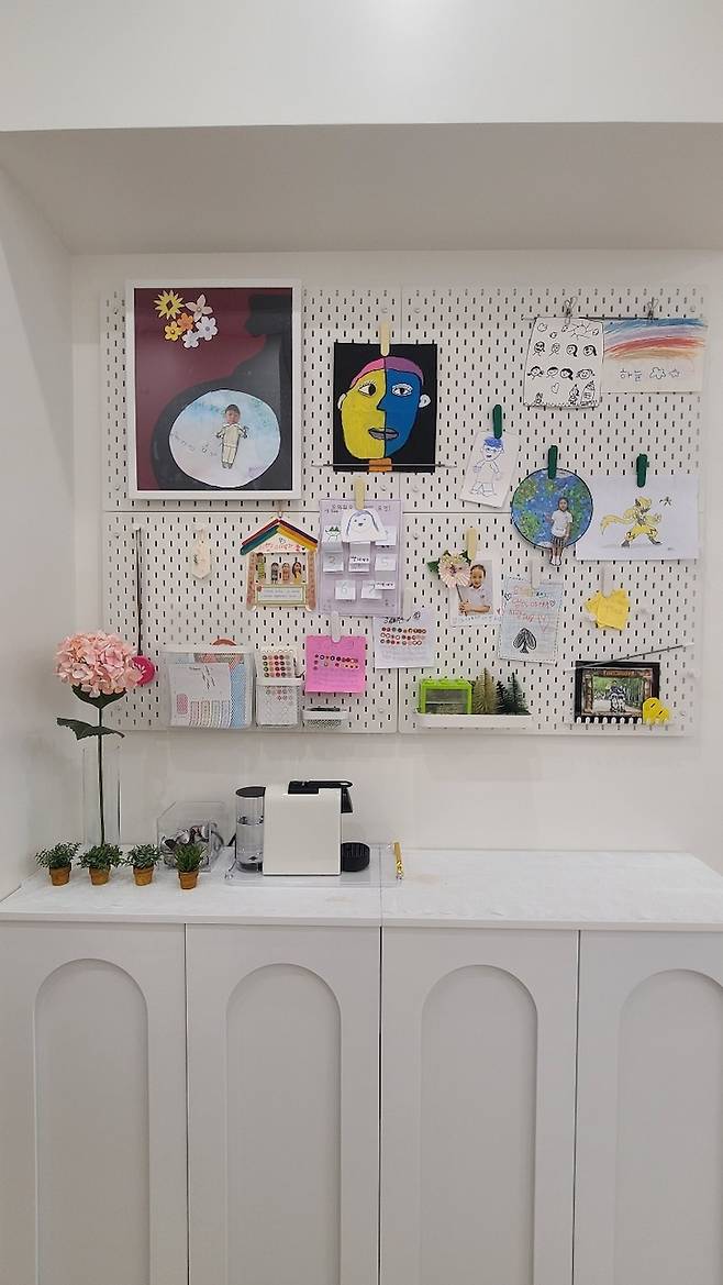 다락으로 올라가는 계단실 옆에는 타공보드를 이용해 아이들의 소소한 작품을 걸어 놓을 수 있는 공간을 마련했어요. 유치원이나 학교에서 만들어온 결과물들을 아이들 마음대로 걸어 놓을 수 있도록 해주었더니 너무 좋아합니다.