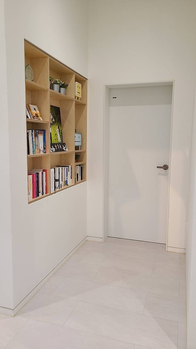 안방 문 앞 공간이에요. 좌측은 현관인데 벽을 뚫어서 자작나무로 장을 짜넣고 책장으로 활용하고 있습니다.