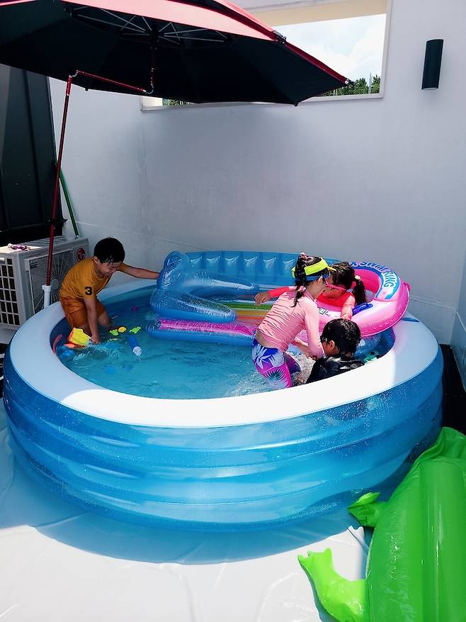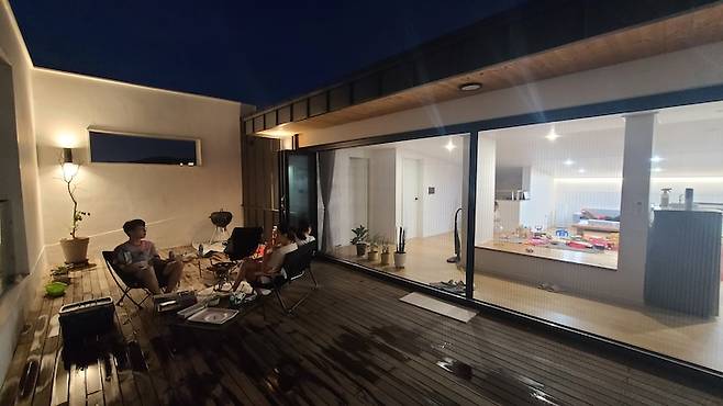 테라스 역시 저희에게는 가족이 함께 할 수 있는 소중한 공간입니다. 하교 후 아이들이 안전하게 뛰어놀 수 있는 공간이자, 친구들을 초대해서 모래 놀이도 하고 여름에는 튜브 풀을 설치해 물놀이도 하고요, 캠핑을 좋아하는 저희 가족에게 훌륭한 캠핑장이 되어주기도 합니다.