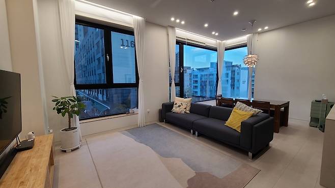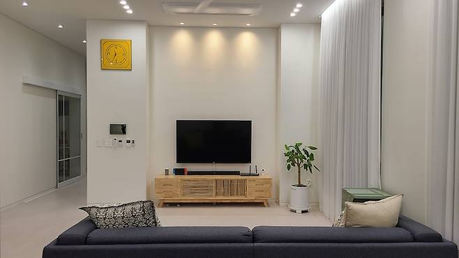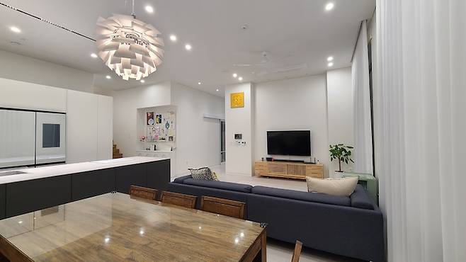 보통 신축하면 가구도 새로 하기 마련인데 식탁과 소파, 텔레비전은 이전 집에서 사용하던 제품을 그대로 가져왔어요. 기존에 가지고 소파가 등받이가 높지 않아 소파를 중심으로 거실과 다이닝이 분리되면서도 답답해 보이지 않을 것 같아 그대로 사용하기로 했어요.