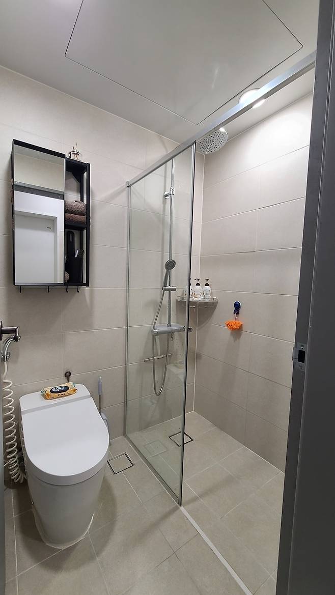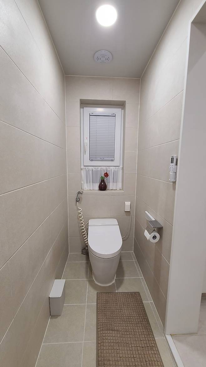 안방 욕실이에요. 건물 외벽 쪽에 위치하고 있어서 난방을 위해 휴젠트를 설치했어요. 건식으로 사용 중입니다.