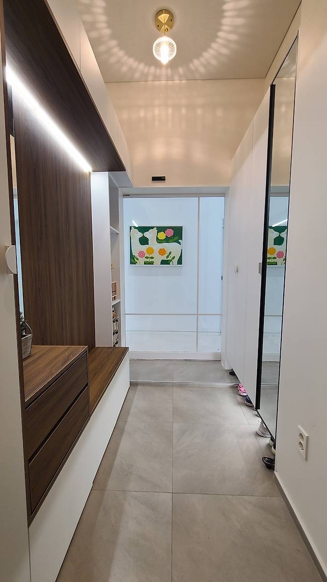 들어서자마자 보이는 현관의 모습입니다. 아이들이 아직 어려서 신발 신을 때 오래 걸리는 편이라 벤치 체어를 구성하고 싶었는데 벤치는 목공의 영역이었더라고요. 그걸 모르고 건너뛰어서 신발장 업체에 요청해서 제작하다 보니 결과물이 썩 마음에 들지는 않지만, 기능적으로는 문제가 없어 실용적으로 잘 사용하고 있습니다.