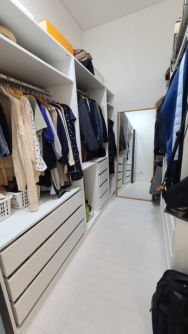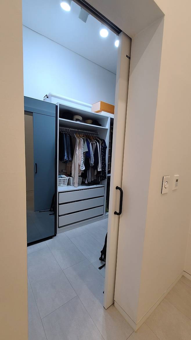 안방 드레스룸입니다. 높은 층고를 모두 활용하려고 업체를 통해 시공할까, 고민했어요. 그런데 높은 곳까지 수납을 꽉꽉 채워 만들어도 실제로 활용할 수 있을 지가 의문이더라고요. 그러다 기존에 보유하고 있던 이케아 PAX 시리즈의 모듈을 추가로 구매해 확장하여 설치했습니다.