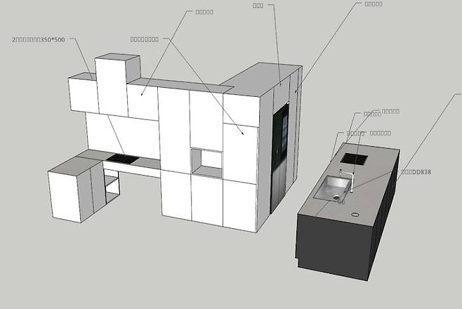 주방입니다. 다른 공간은 전부 제가 직접 구상했는데, 유일하게 디자인 업체와 함께 진행한 공간입니다. 원래는 위에 이미지처럼 상부장이 없는 일반적인 ㄱ자 형태의 레이아웃을 생각했었어요. 이후에 업체 제안으로 키 큰 장과 아일랜드로 구성하게 되었고 매우 마음에 들어요.