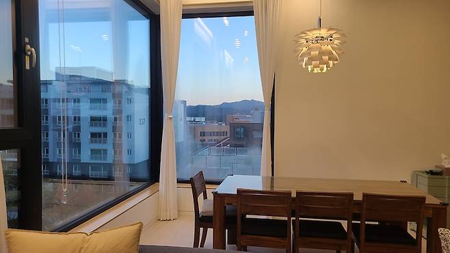 길 건너 큰 아파트 단지가 위치해 있어 편의 시설들이 가까운 편이에요. 도보 1분 거리에 초등학교와 편의점, 커뮤니티 센터가 있어요. 사진은 아침에 찍어서 밖에 아직 어두운데, 낮에 해가 들기 시작하면 카페에 온 것처럼 환한 다이닝 공간이 됩니다.
