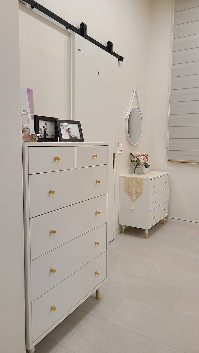 저는 화장품이 별로 없는 편이라서 별도로 화장대를 구입하지는 않았고, 같은 종류의 수납장을 두 개 사서 낮은 수납장을 화장대로 이용하고 있습니다. 높은 수납장은 안방 욕실 앞에 둬서 주로 속옷류를 보관하는데 사용하고 있어요.