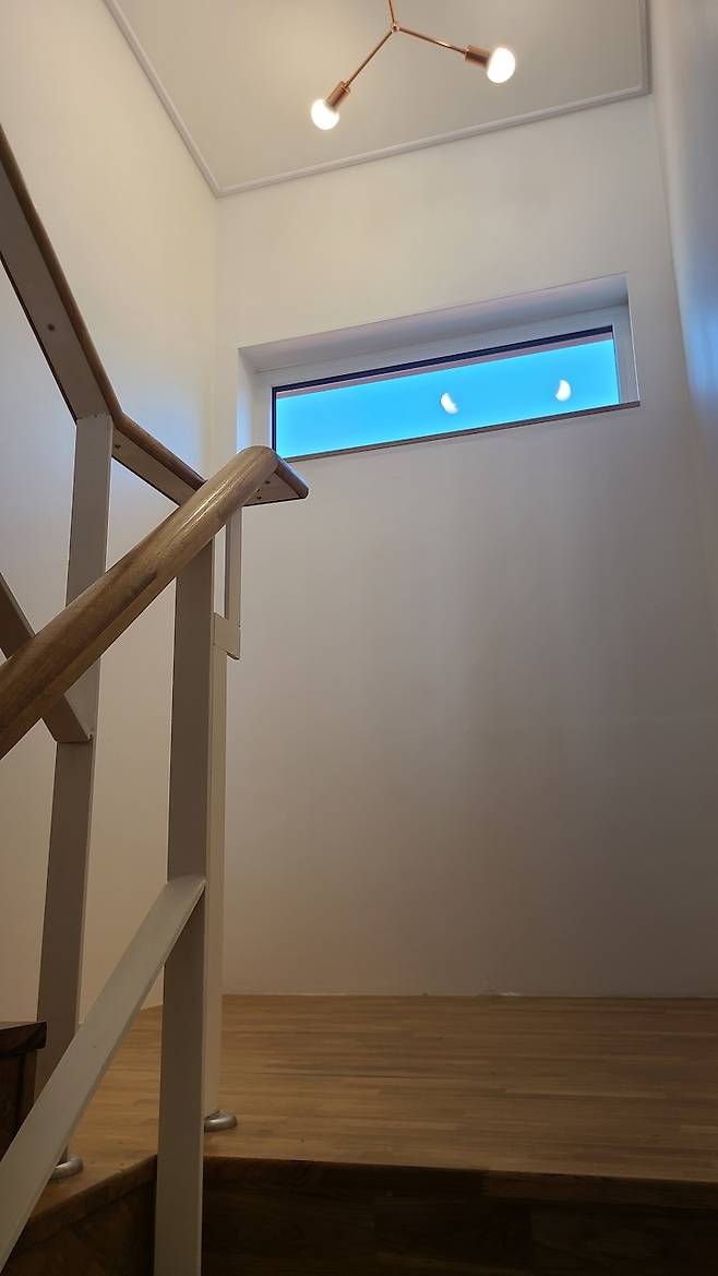 다락층으로 올라가는 내부 계단입니다. 상부 갤러리창이 동향이라 아침이 되면 이 창에서 거실 쪽으로 햇살이 쏟아져 들어와요.