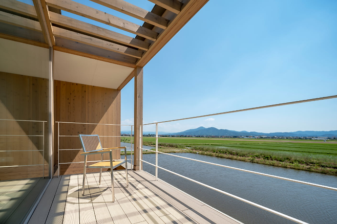 스이덴 테라스에는 2층짜리 목조 건물 다섯 동이 있다. 객실은 119개다. 나무의 온기를 살린 아늑한 공간 속에서 사방이 논으로 펼쳐진 풍경을 바라보며 힐링할 수 있도록 설계됐다. 물이 잠긴 논이 오션뷰 저리가라 할 정도의 마성의 분위기를 자아낸다.